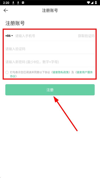 4、在注册账号页面,依次填写手机号、验证码、新密码,勾选协议后点击注册,完成账号注册操作。