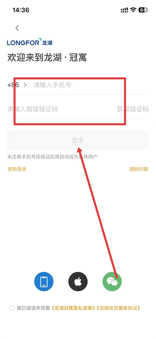 3、进入登录注册界面后,找到并点击手机号登录按钮。