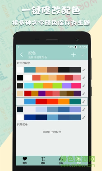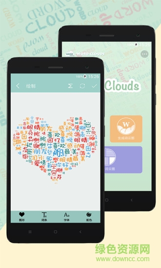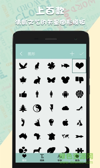 词云图生成器app是一款支持词云图制作的图文编辑软件,丰富的艺术字体和矢量图形模块,让你制作词云更加方便,同时在该软件中为用户提供了心形、四叶草、箭头、太极、脚印、灯泡、枫叶、猫咪、蝴蝶、小猪、高跟鞋、数字、字母等海量的形状,并一张图中支持用户选择楷体、仿宋、黑体、书宋等一种或多种字体,因此用户制作图片十分的轻松简单,快来绿色资源网下载体验吧。