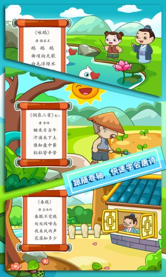 《儿童教育乐奇学唐诗》是专为幼儿定制的唐诗学习软件。了解中国传统文化,学习热门的唐诗,在不知不觉中掌握汉语文字的韵律感,对宝宝的语音表达能力带来更好的帮助。