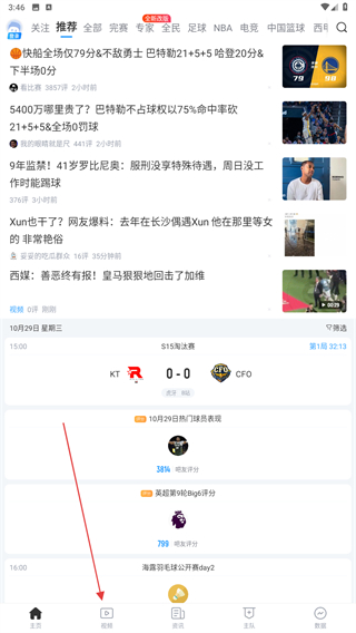 1、打开直播吧的APP,在首页下方导航栏中点击视频的按钮。