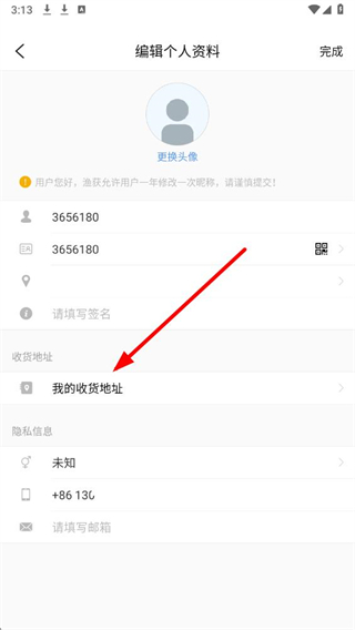 1、打开渔获APP,在我的页面点击头像进入编辑个人资料页面。