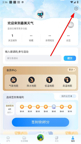 1、打开最美天气APP的软件,进入我的页面,点击右上角六边形设置的图标,进入设置的界面。
