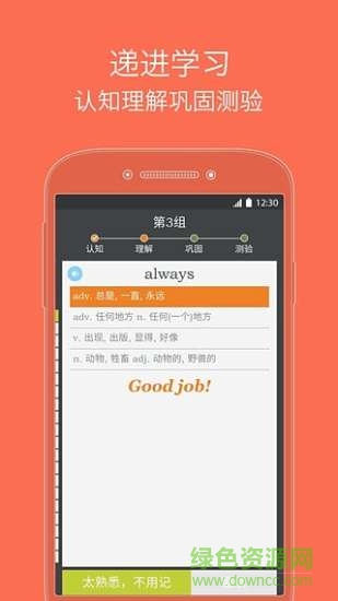 采用分组记忆单词,每组20个单词,将单词背诵分割为独立小段,并提供独特的递进式学习方法:按照认知→理解→巩固→测验的过程,确保学习者牢记并熟练掌握单词运用。