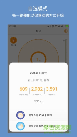 在开启每一轮的复习前,年轮单词会告诉你到目前为止你一共掌握了多少单词。你可以选择所有单词整体回顾一遍,或是只看没有掌握的单词。