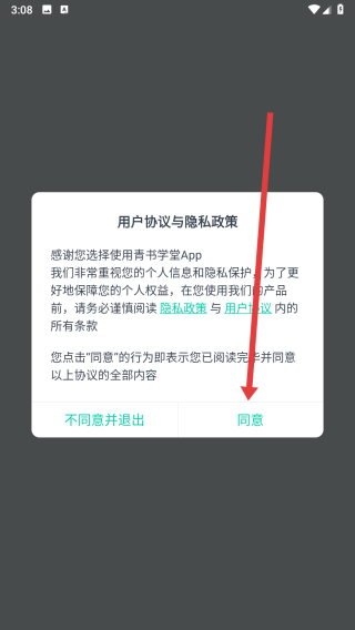 1、在打开青书学堂app后,通过点击弹窗中的同意按钮进入使用。