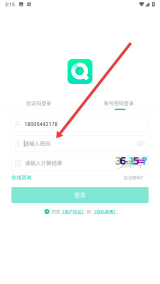 4、在填写好手机号后出现计算图,继续输入密码和计算结果即可点击登录。