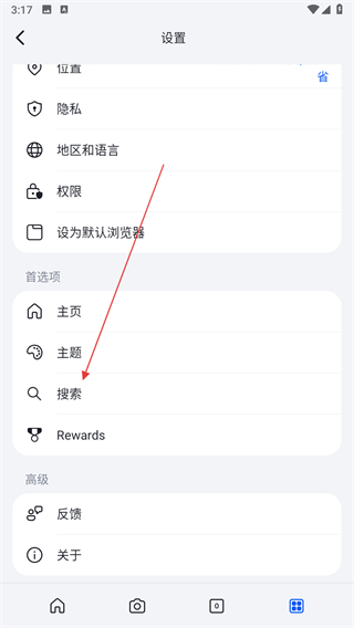 3、进入设置页面后,在首选项分类下找到搜索选项并点击进入。