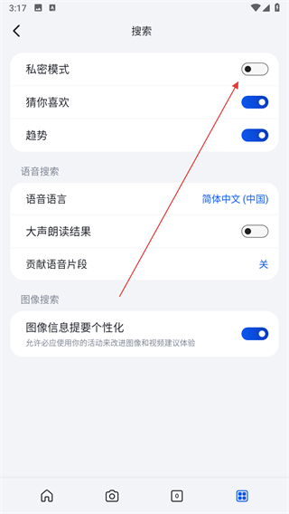 4、在搜索界面中找到私密模式对应的开关,点击开关即可开启该模式。