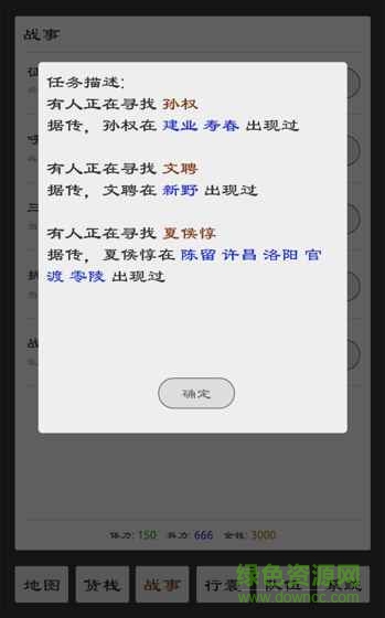 开局随机的是85/54,然后招陈登,再然后去建业,寿春,豫章这三个地点刷(到这一步和前面那位仁兄相同),不同的是我在刷的同时找了鲁肃,凌统,太史慈聊天(本来还有陆逊的,太难碰到,而且夷洲打完看到兵力够就跑去找公瑾啦),而且,我一直保持兵力在600左右,当金币有28000的时候买个精铁剑(羽扇留着招鲁肃)然后屯兵吧(到10金币才招,可以少花钱)。