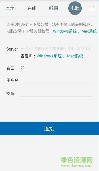 三种来源选择观看的美剧:手机本地、在线和电脑上的美剧视频。手机和电脑通过FTP连接,需要电脑上安装FTP服务器。