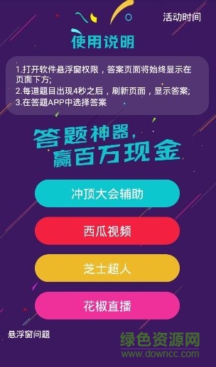 答题神器app是一款同时支持冲顶大会、西瓜视频、芝士超人、花椒直播等答题游戏的服务工具,设置悬浮窗功能后您就可以快速进入答题现场,第一时间抢答赢取百万现金哦!快来绿色资源网试试吧!