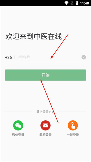 1、打开中医在线,在登录页面输入手机号后点击开始按钮。
