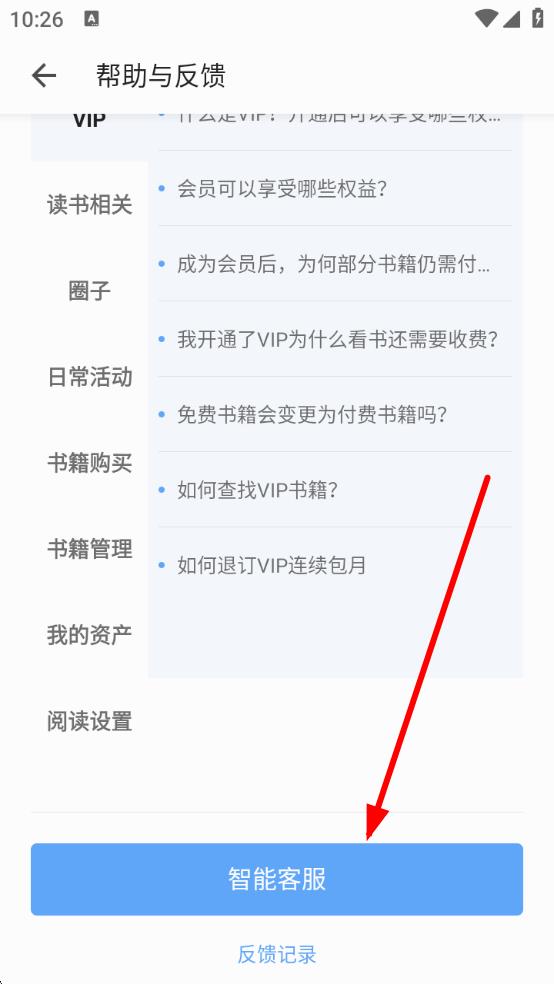 3、在帮助与反馈页面底部,点击智能客服按钮,即可与掌阅客服进行沟通咨询。
