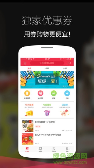 购物优惠券:用券购物更便宜!更有海量外卖、打车、电影票、团购、酒店、旅游代金券领不停!