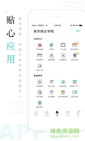 i晓庄V3.0收集分析了庞大的校园信息,并进行提炼设计,只为做出最简单、最直接、最懂你的首页。目前已集成众多应用板块——生活办公、教育教学、学工应用、校园资讯、外部服务。