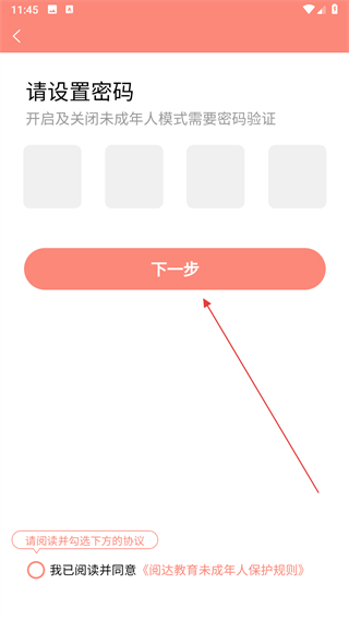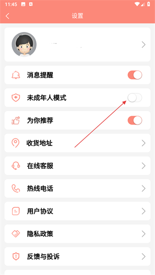 2、在设置页面点击未成年人模式右侧的开关按钮,进入设置密码页面。