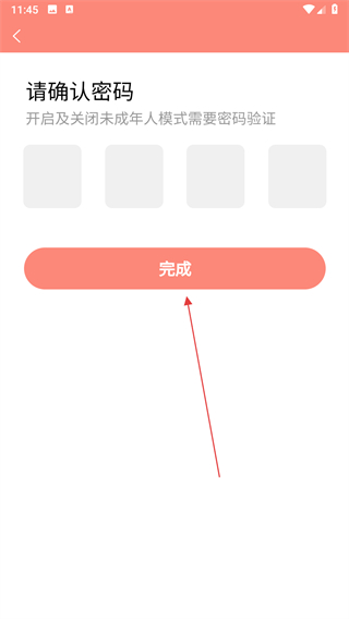 4、在确认密码页面再次输入密码后点击完成按钮,即可完成模式的开启。