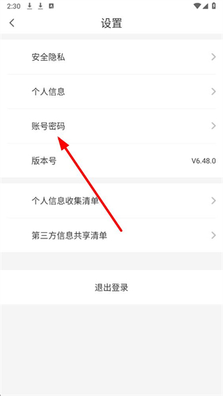 3、在设置页面,点击账号密码选项,进入密码重置的操作界面,准备修改登录密码。