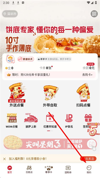 1、进入必胜客应用,点击页面底部我的选项,进入我的页面。