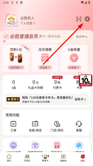 1、打开必胜客进入首页,点击底部导航栏中的团购券选项进入团购界面。