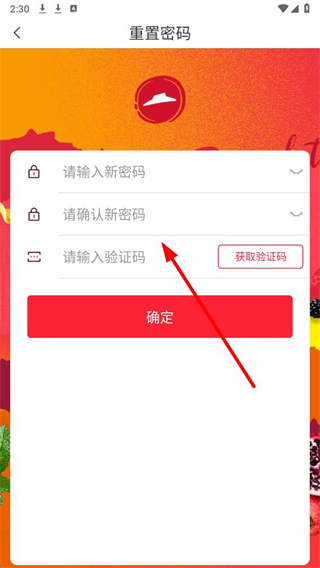 4、在重置密码界面,依次输入新密码,获取并填写验证码后,点击确定按钮,完成密码修改。