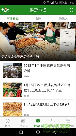 包括“市场动态”、“物流”、“经纪人”三个二级页面,为农民朋友适时了解市场、搞活流通提供有力帮助。