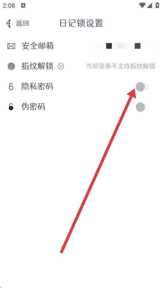 3、进入日记锁设置页面后,点击隐私密码右侧的开关按钮。