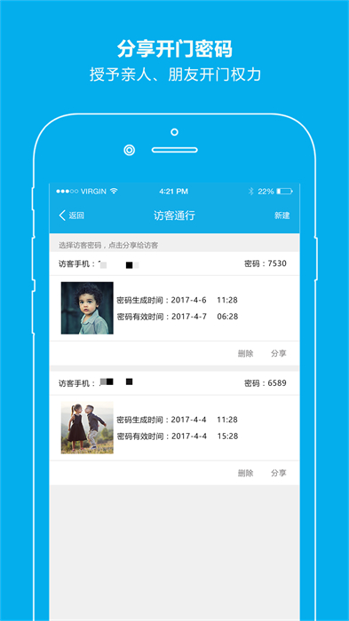 3.访客临时通行密码开门。点击APP上的访客通行,按要求输入需要分享开门访客的手机号临时通行密码的有效时间,生成临时密码。并通过微信、qq、短信的形式,分享给临时访客。