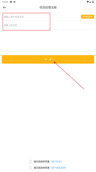 3、输入手机号、验证码后点击下一步即可完成注册。
