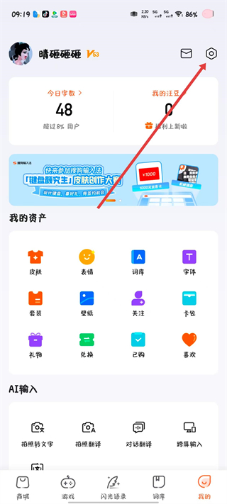 1、打开搜狗输入法,切换至底部导航栏的我的页面,在页面找到设置按钮并点击,进入设置界面。
