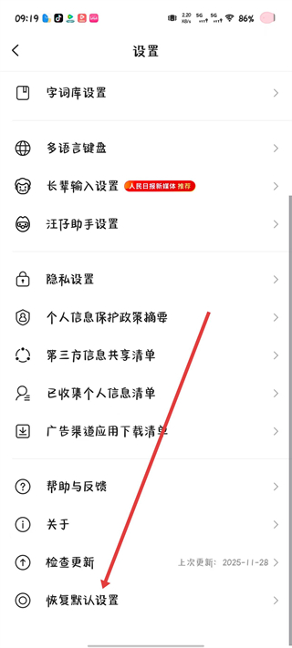 3、在设置列表中向下滑动,找到恢复默认设置选项并点击,弹出确认提示框。