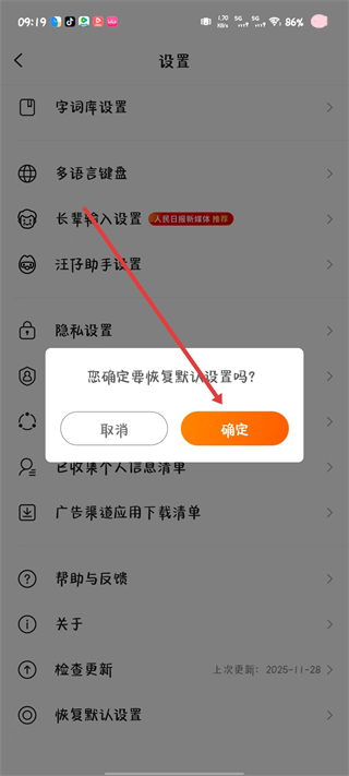 4、在提示框中点击确定按钮,即可将搜狗输入法的设置恢复为初始默认状态。