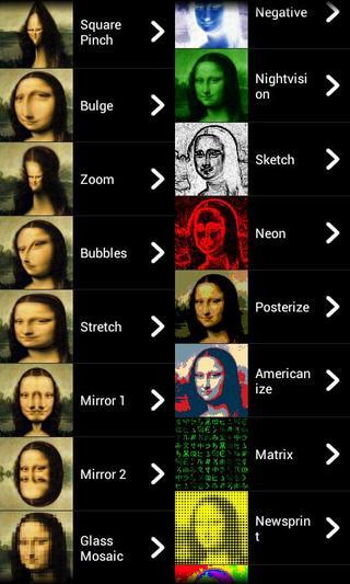 变形相机(WarpCam Free)是一款支持不同的颜色,扭曲方式等,支持实时变形拍摄,支持分享的恶搞的有趣拍摄软件。能够把你朋友的脸扭曲形的百变相机。