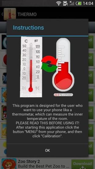 室内温度计(thermo)是一款很好的温度参考工具,准确测试你所在房间的温度,同时显示摄氏和华氏温度,软件可以移动到SD卡上。小编的希望就是界面弄漂亮点,那样就完美了!
