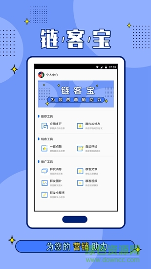 链客宝是一款简单方便的微信操作管理工具;支持多开、群内加好友、朋友圈一键点赞、一键评论、消息群发等功能,功能强大,解放双手。有效避免操作失误,提升效率;采用全新的技术方案,基于安卓系统开发,让您更快分享文章、视频、图片、小程序;是微商营销必备工具,为您的营销助力。