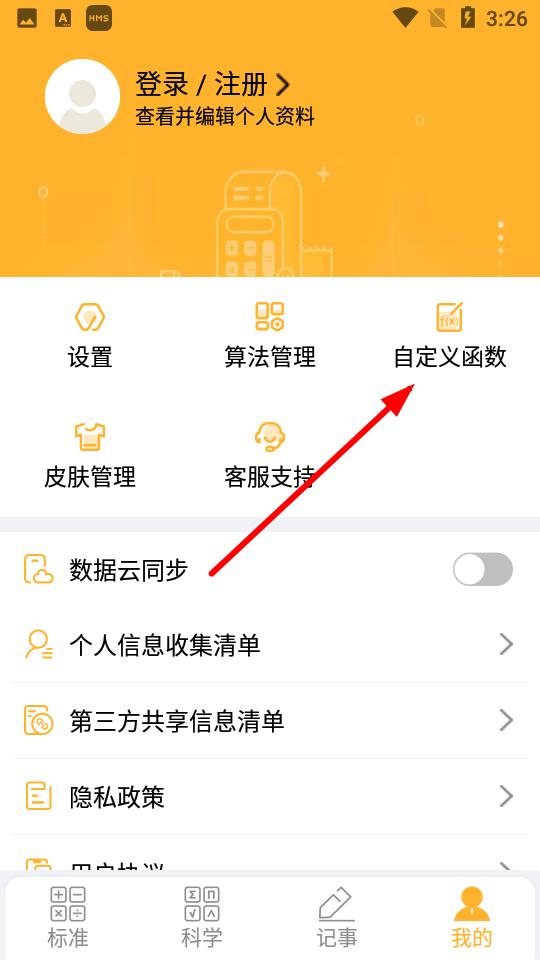 2、在个人设置页面中,找到并点击自定义函数选项,进入新增函数设置界面。
