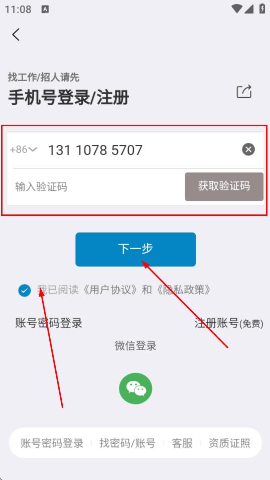 4、在手机号登录/注册页面,输入手机号码,勾选我已阅读用户协议和隐私正常,输入验证码,点击下一步,完成注册。