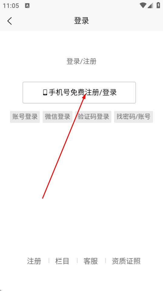 3、在登录页面,点击手机号免费注册/登录按钮。