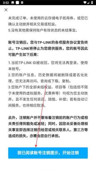3、点击我已阅读账号注销提示,开始注销按钮。
