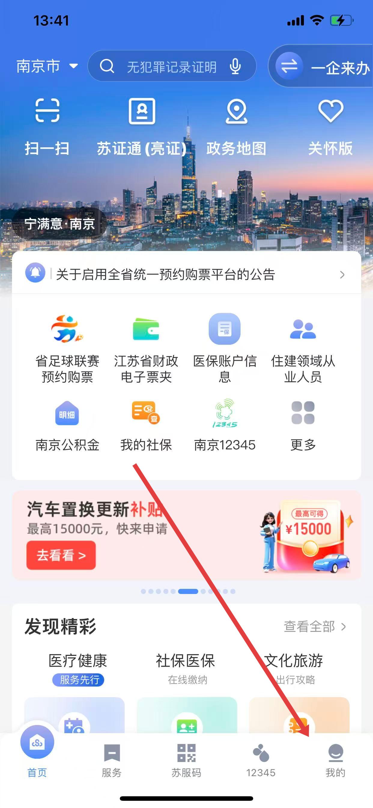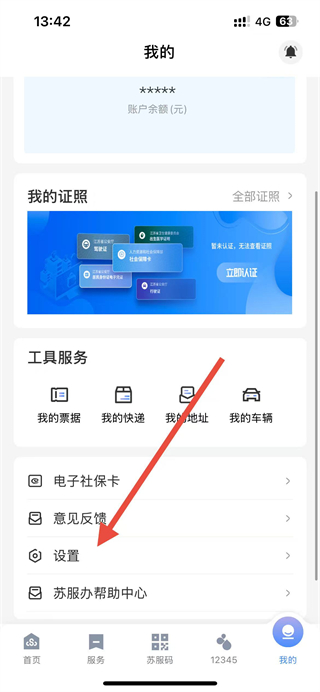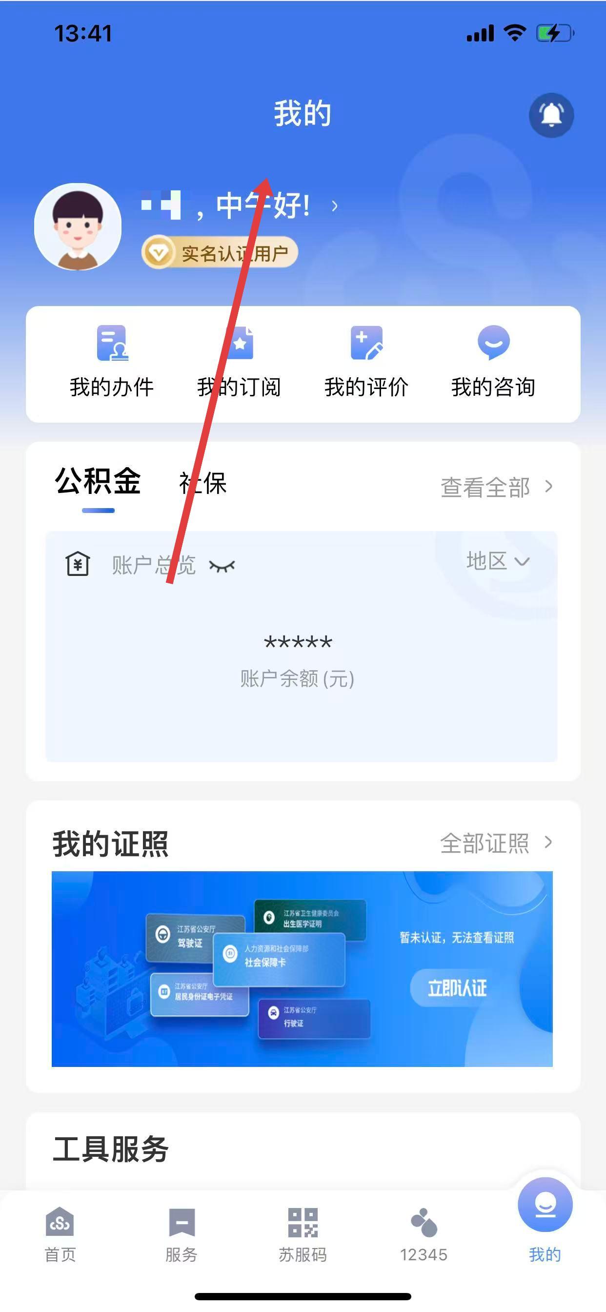 1、在苏服办app首页点击我的选项,进入个人页面。
