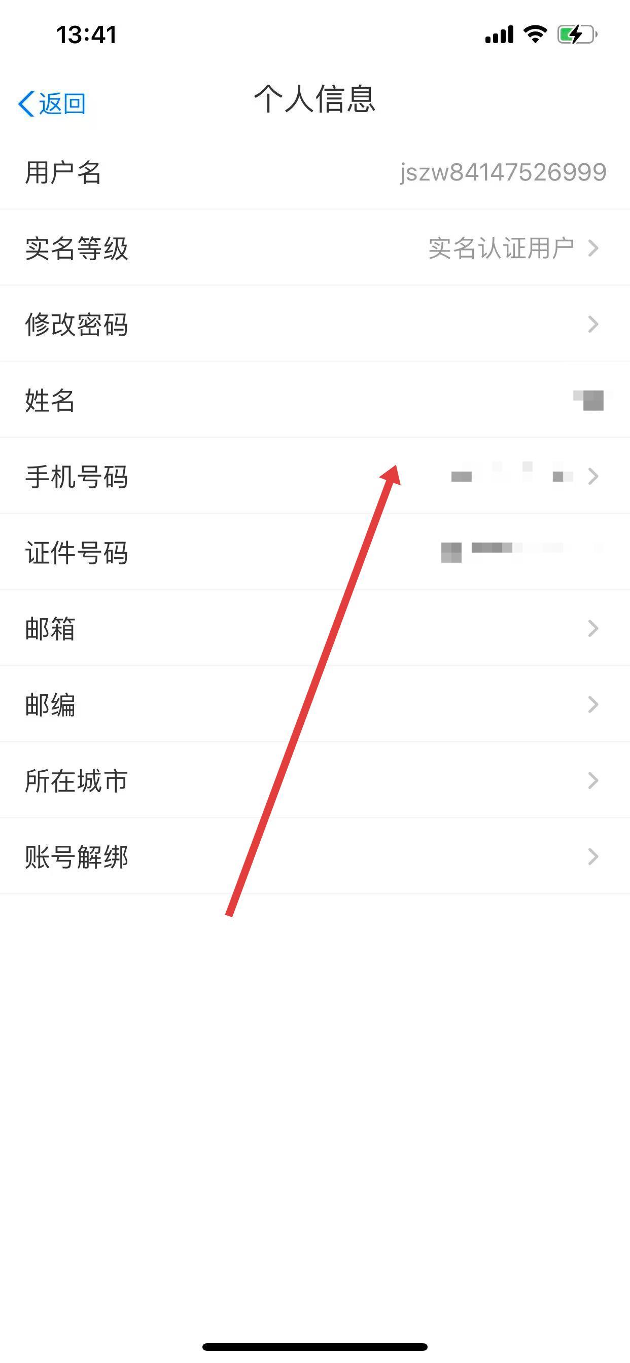 3、在个人信息页面中,找到并点击手机号码选项。