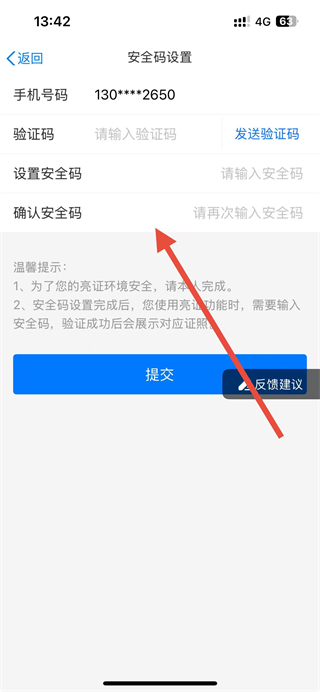 4、在页面输入验证码,设置安全码并确认安全码,点击提交按钮,即可完成安全码设置操作。