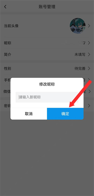 4、在修改昵称窗口输入新昵称,点击确定完成昵称修改操作。