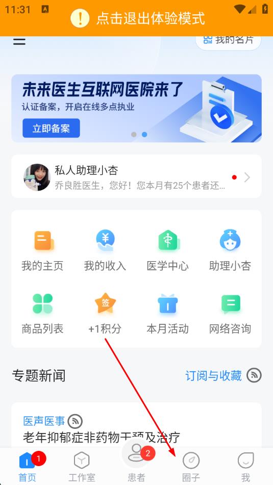 1、打开杏仁医生应用,点击底部导航栏中的圈子选项。