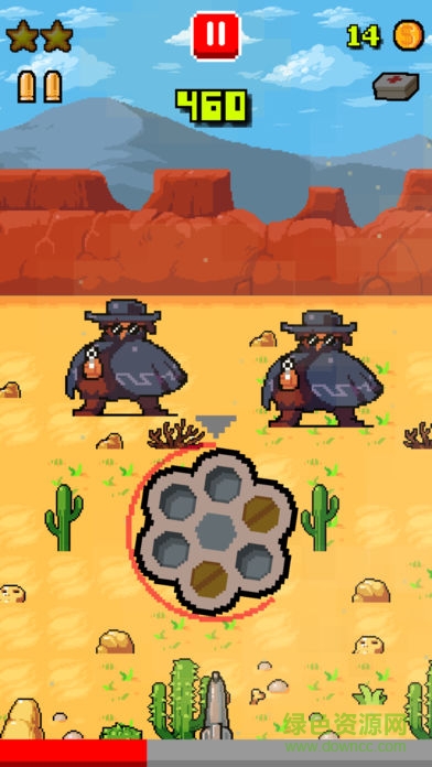玩家只要通过点击屏幕的方式来进行射击就能消灭面前的敌人了。不过射击的时机还是很讲究的,需要等指针移动到装有子弹的弹夹上再点击屏幕才行,这也正好与左轮枪的特质相符,有一种在玩轮盘赌的感觉,一旦点击到了空的弹夹或者超过没有在限定时间内开枪,你的对手就会掏枪将你击毙。而且随着游戏进程的深入,你一次所要面对的敌人数量就会逐步增加,弹夹的体积还会变小而且在屏幕中不停的晃动,难度也就可想而知了,对于玩家的反应速度也有着很高的要求。