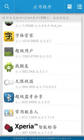 超级蓝牙分享是一款可以将手机中的任何应用程序(包括已安装的应用程序和系统自带的应用程序)、视频、音乐、图片、word,excel,pdf工作文档,压缩包等多种格式的文件,轻松的传送到另外一台手机上有了超级蓝牙分享助手,您可以轻松的与朋友分享好玩的游戏,应用程序,图片,以及更多好玩的东西只需一台机器下载或已安装任一应用即可通过超级蓝牙分享助手分享到周围的所有机器!
