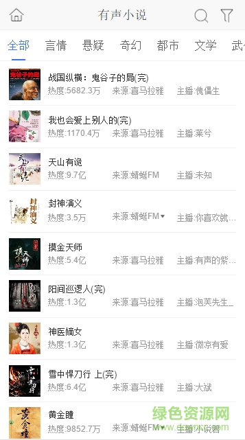 1.【海量音源】网罗海量书籍资源,仙侠武侠、婚恋言情、悬疑灵异、科幻末世等海量高清有声阅读资源,每天都有新鲜资源涌入;