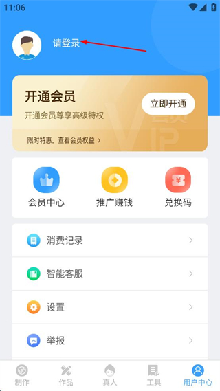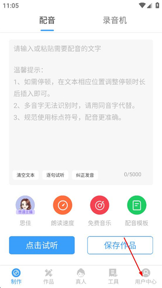 1、打开配音应用,在制作页面点击底部的用户中心选项,进入对应的个人页面。