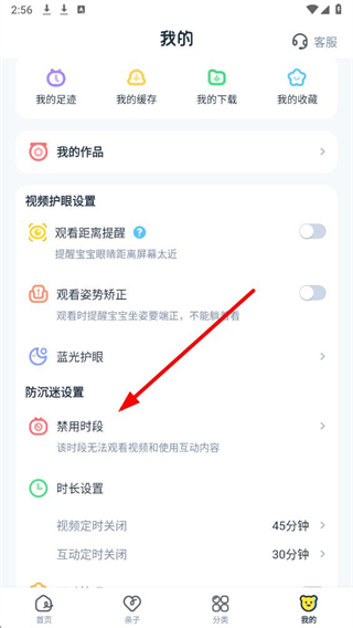 2、在当前页面,找到防沉迷设置板块下的禁用时段选项并点击,进入对应设置界面。